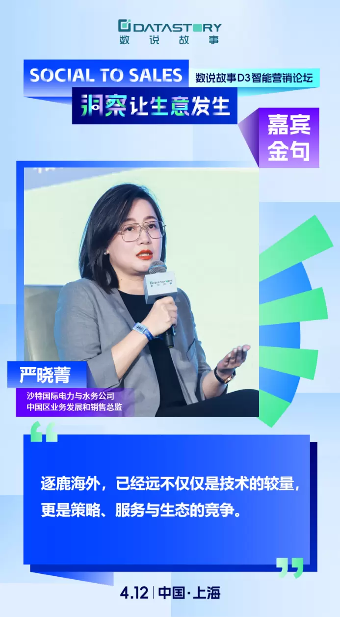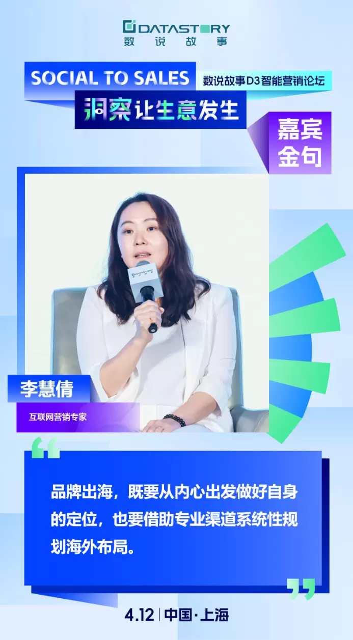 关于“中国品牌全球化布局”的实践,论坛特邀周大福珠宝集团首席数码官张宏光 Patrick、互联网营销专家李慧倩(路微)、沙特国际电力与水务公司中国区业务发展和销售总监严晓菁、跨海科技创始人龚毅James等四位来自不同行业领域的出海专家,数说故事副总裁孙淑娟Jessie作为主持人,共论《从“出海品牌”到“全球名牌”,中国品牌如何加速全球化布局?》主题圆桌,从出海品牌、平台到服务商的实战多维角度,共赴出海生意潮。