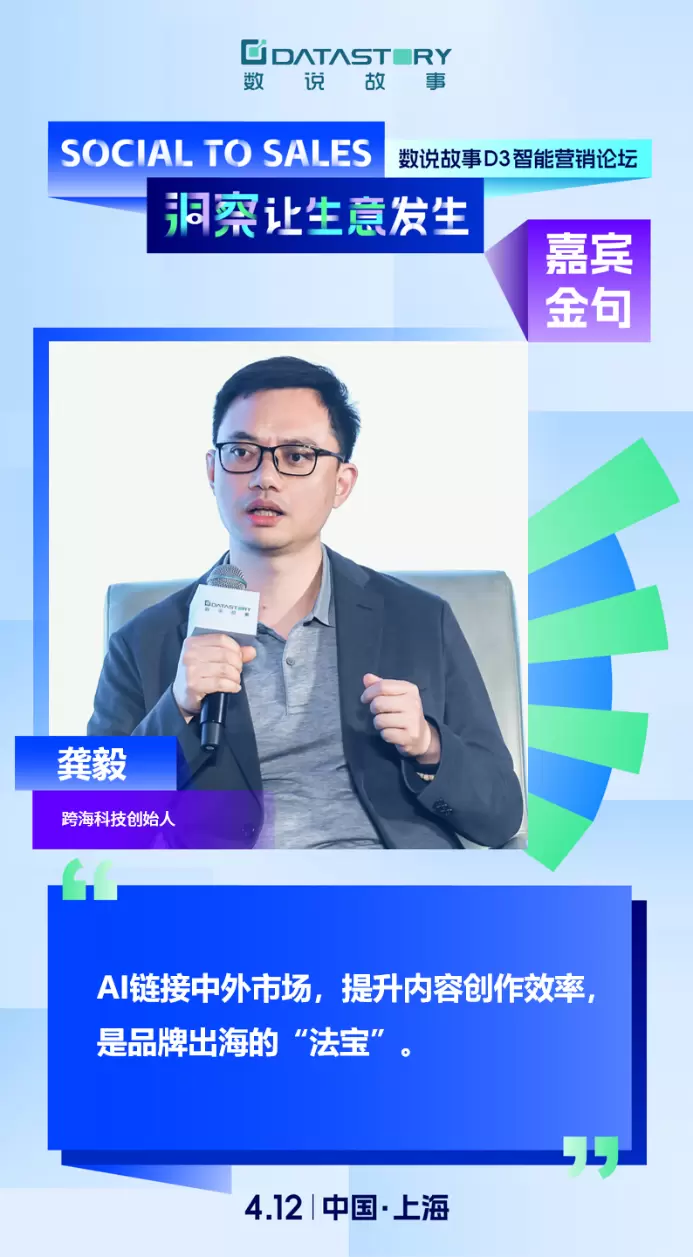 跨海科技创始人龚毅从AI的角度透视出海新趋势,为品牌洞察全球消费者的本地化需求和偏好,打开AI赋能出海营销的创新与转变视角。AI是品牌出海的“法宝”,AI不仅可以帮助我们实现精准的市场定位和消费者洞察,还能高效创作内容,使品牌故事更加深入人心,透过内容与用户关系管理,和海外消费者更好地建立长期联系,提升品牌忠诚度。