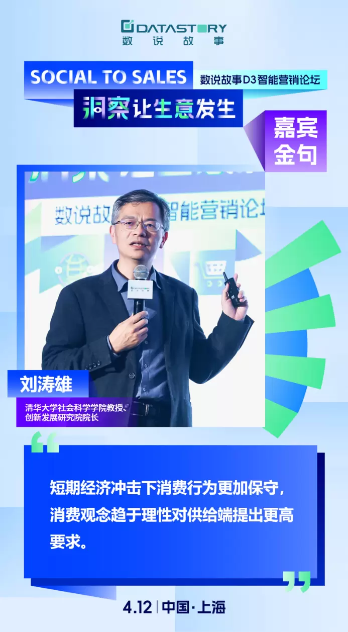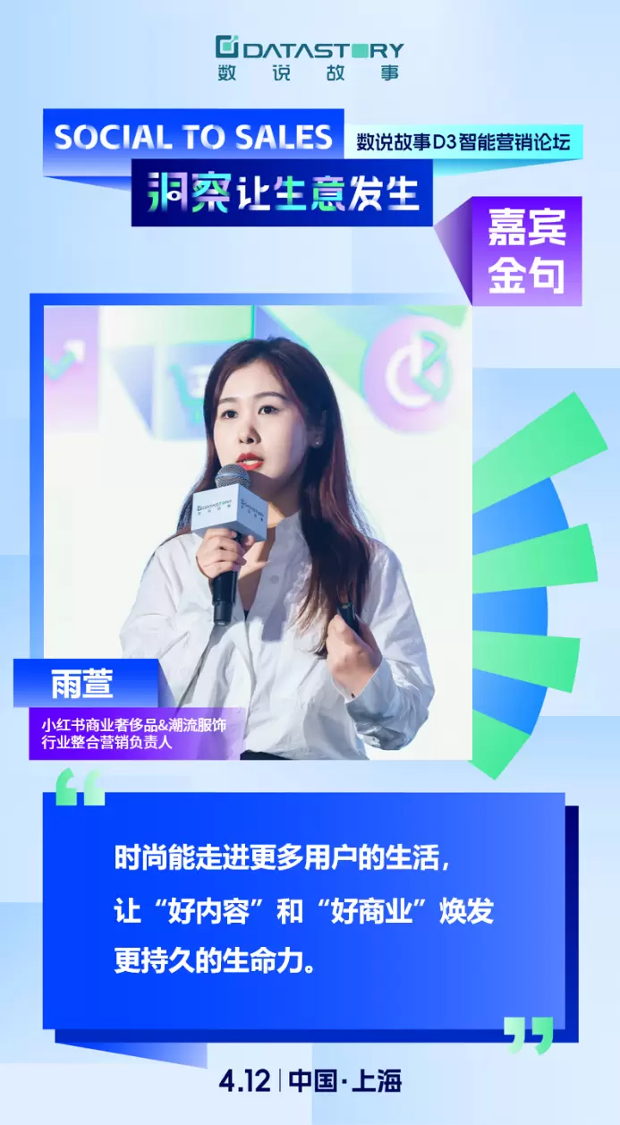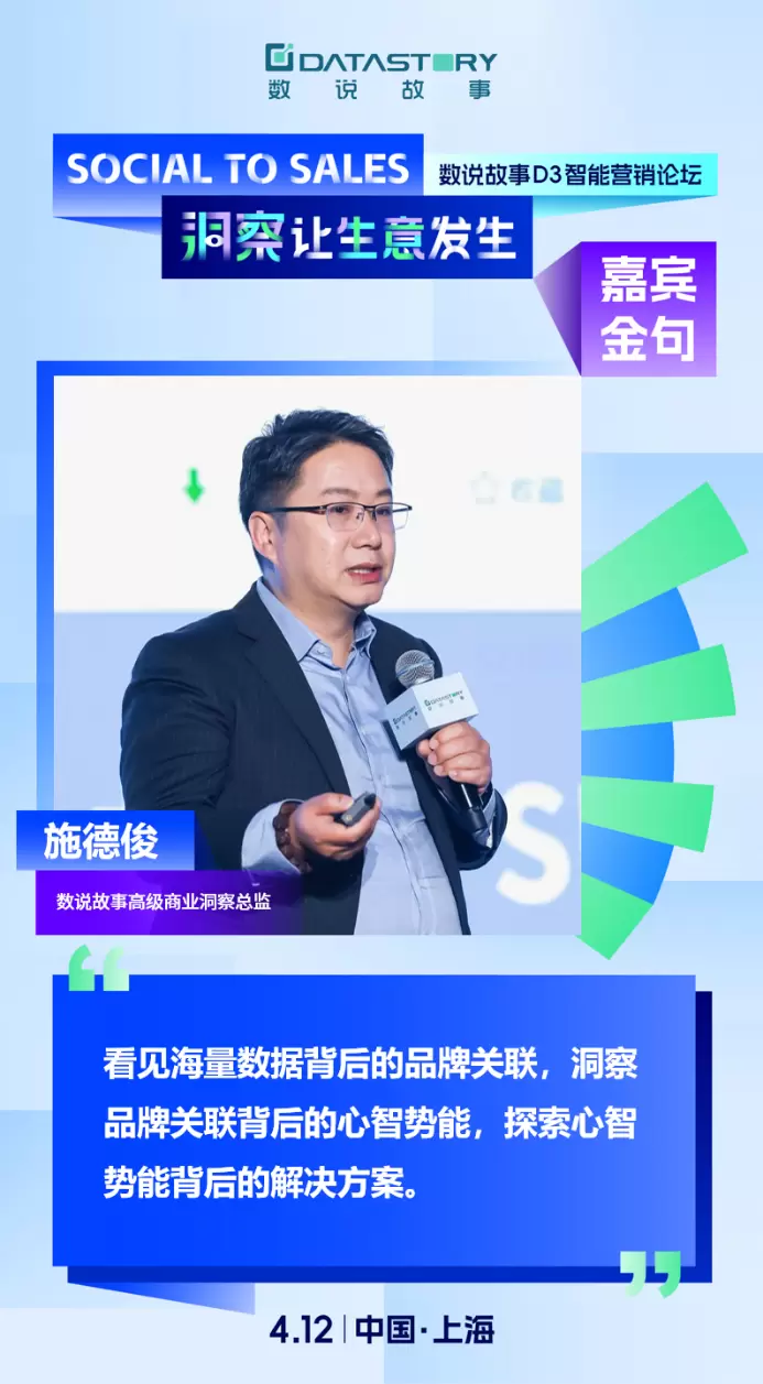 4月12日,以“Social to Sales 洞察让生意发生”为主题的2024数说故事D3智能营销论坛于上海圆满举办,数说故事与来自清华大学、中欧国际工商学院、周大福、小红书、澎湃新闻、互联网大厂营销专家等12位重磅级嘉宾,融合产、研、媒各界实战经验,透过大数据分享了社交媒体新风向、出海掘金思路、消费新弄潮等趋势洞察,用“洞察”重构品牌与生意之间的关联,破局品牌生意可持续增长的进阶生机。