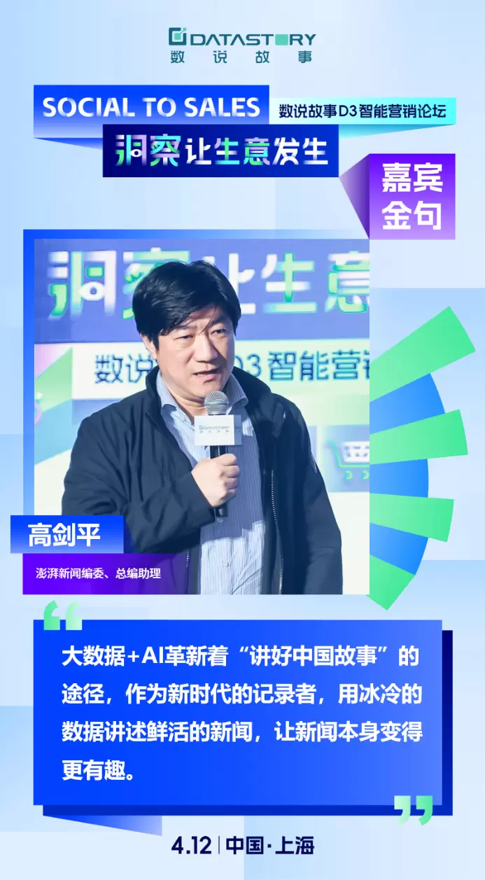、提升接受度、深化理解。他表示:“新时代媒体要讲好中国故事,背后离不开数据的支撑与赋能,在数字化浪潮的推动下,站在媒体深度融合发展的新节点上,澎湃新闻努力打造新型全球媒体,利用大数据+新媒体的形式高品位高格调地讲好中国故事、讲好上海故事、讲好我们身边的故事,用数据展现这一伟大时代里的上海精神。