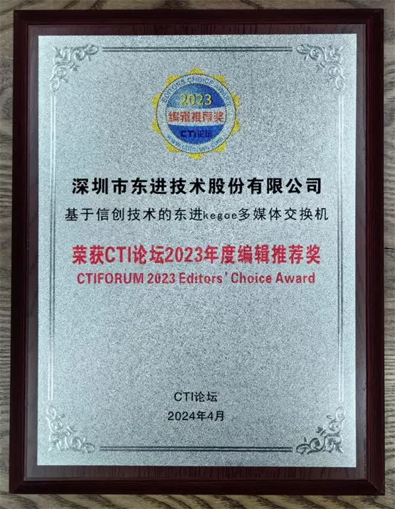 CTI论坛编辑推荐奖是CTI论坛举办的年度ICT领域技术评选活动,借助媒体独特的视角,对本年度ICT领域出现的最新技术和热门产品解决方案进行一次总结和集中展示。基于信创技术的东进Keygoe多媒体交换机凭借在信创领域的硬核实力再获殊荣,这是业内对东进技术产品的高度认可。