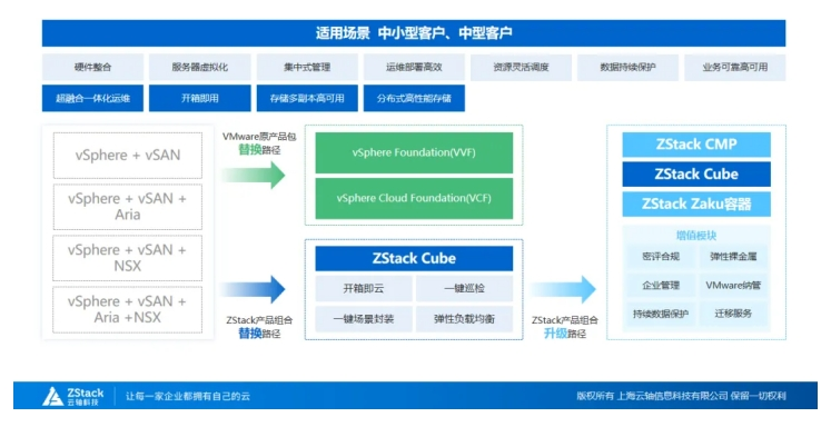 本篇主要解读在什么样的场景下,以ZStack Cube超融合进行替代VMware。对于部分中小企业和中型企业用户,采用的是vSphsre+vSAN或者vSphsre+vSAN+NSX+Aria,VMware为这部分用户可推荐的订阅包主要VVF(vSphere Foundation)和VCF(vSphere Cloud Foundation)两种订阅包。