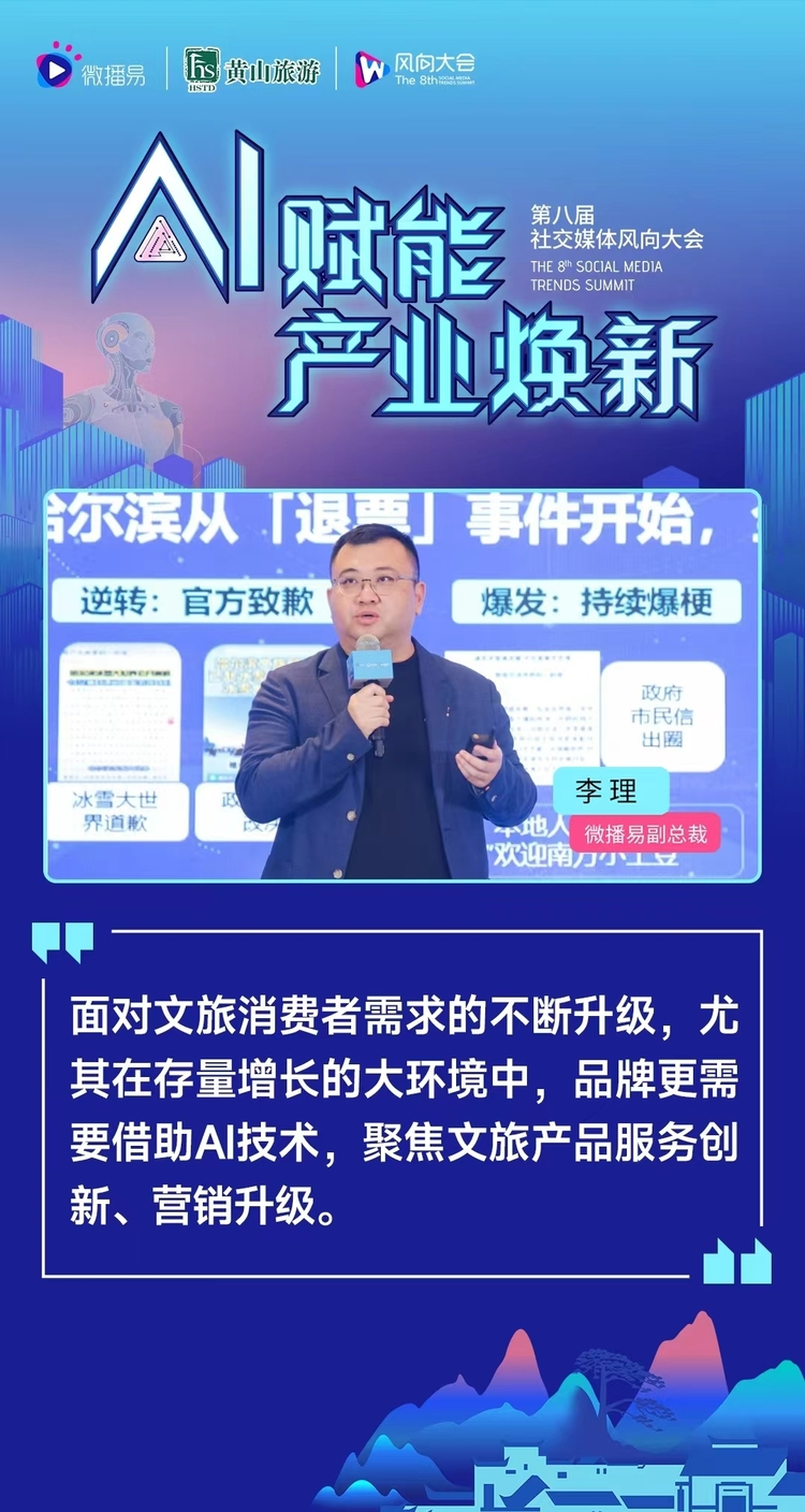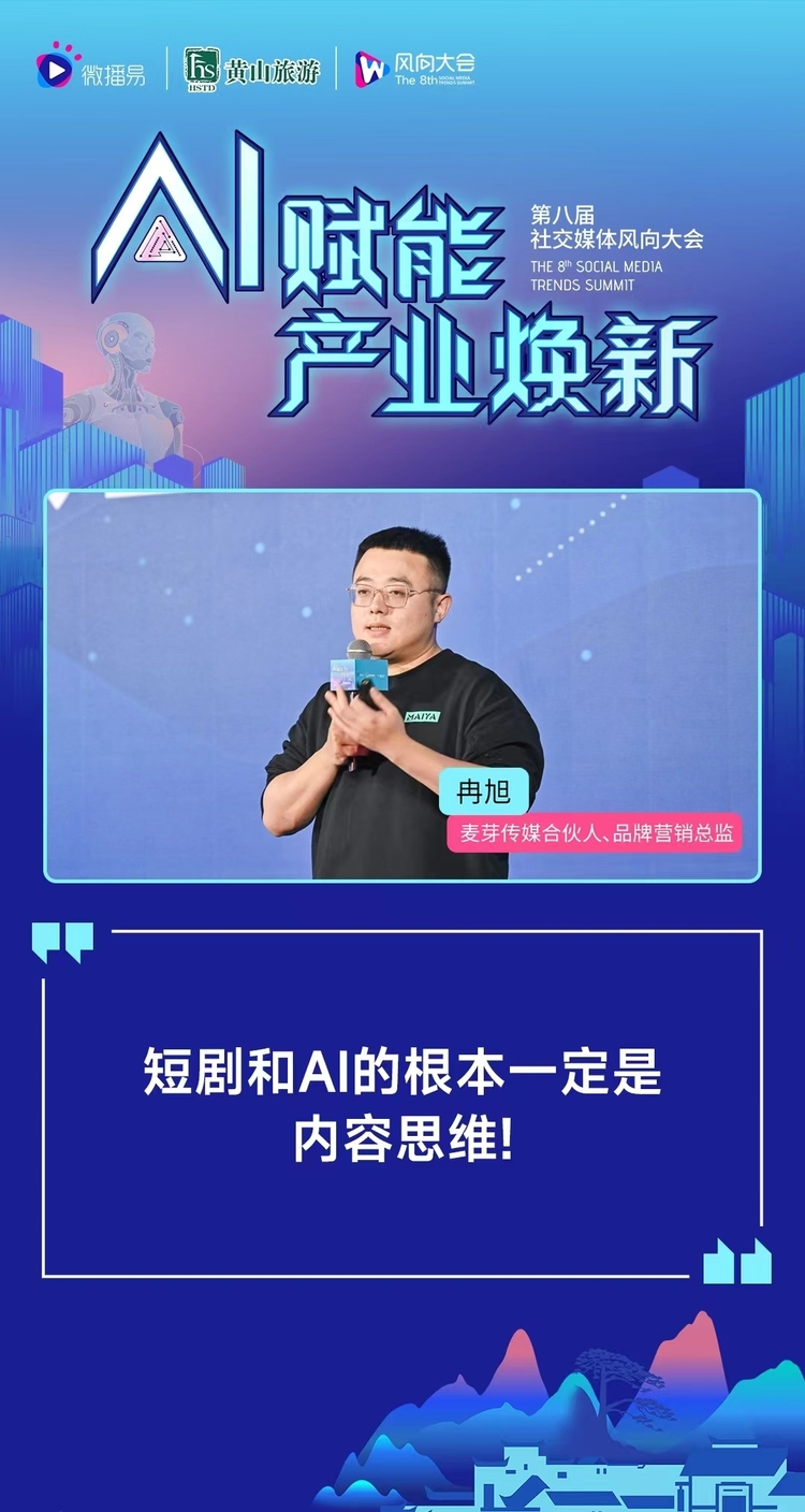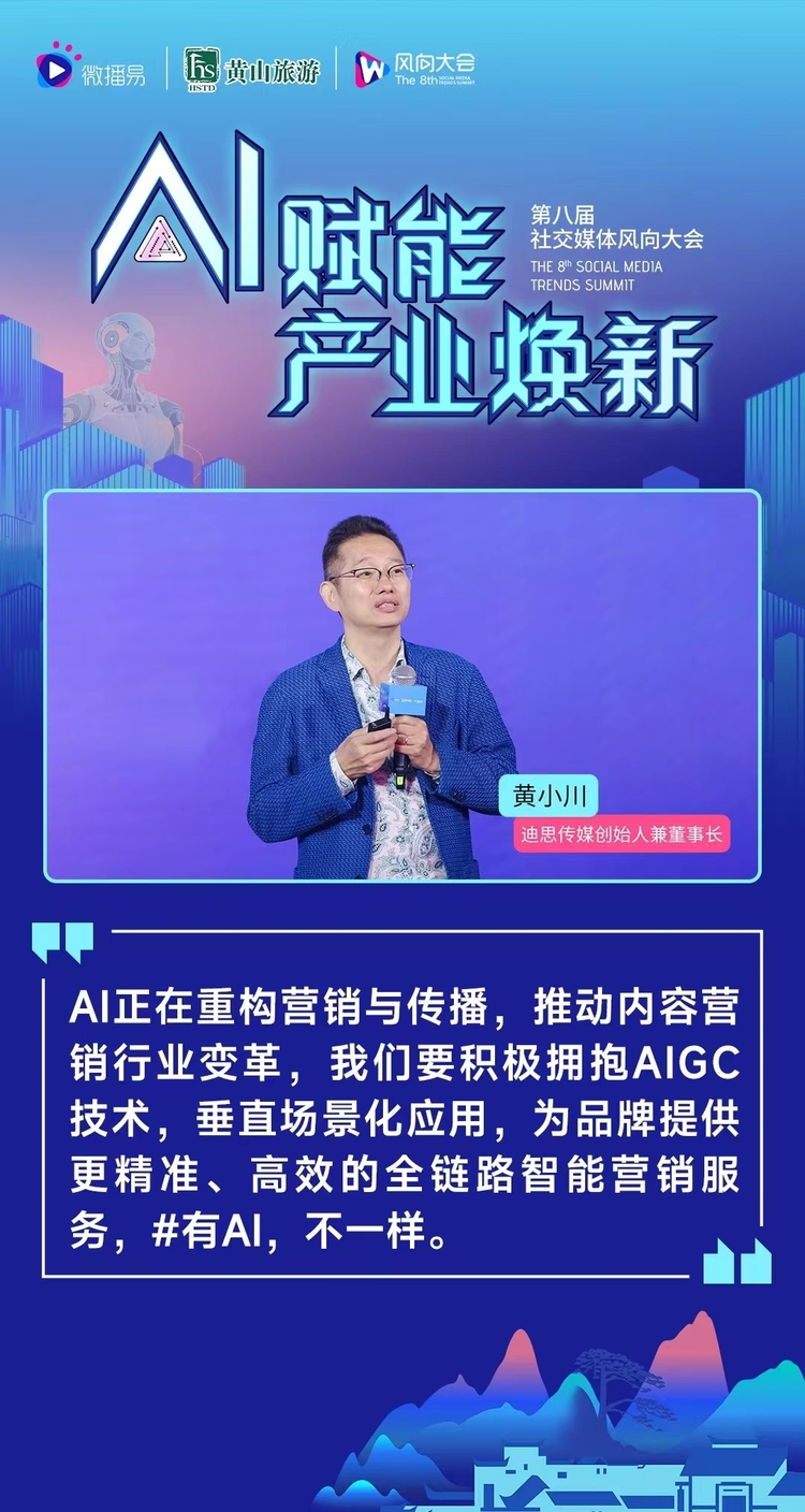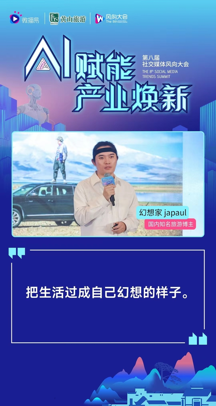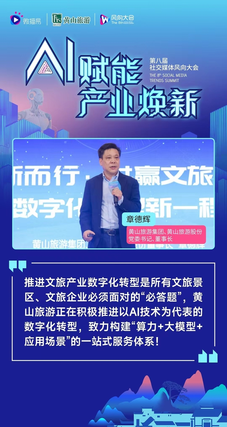 4月15日,由黄山市人民政府指导,微播易、黄山旅游主办,第八届社交媒体风向大会“AI赋能•产业焕新”峰会在黄山举行。本次大会邀请AI领域应用专家、平台方、技术方、品牌方、内容创作者代表,就产业创新、营销创新、文旅创新进行了一天的脑暴探讨,聚焦应用场景、着重实践落地、期望能通过“AI+”创新,“+AI”提效,推动AI新质生产力在产业中落地应用。