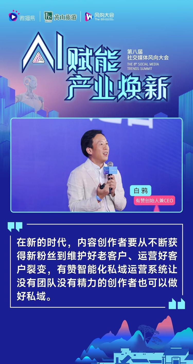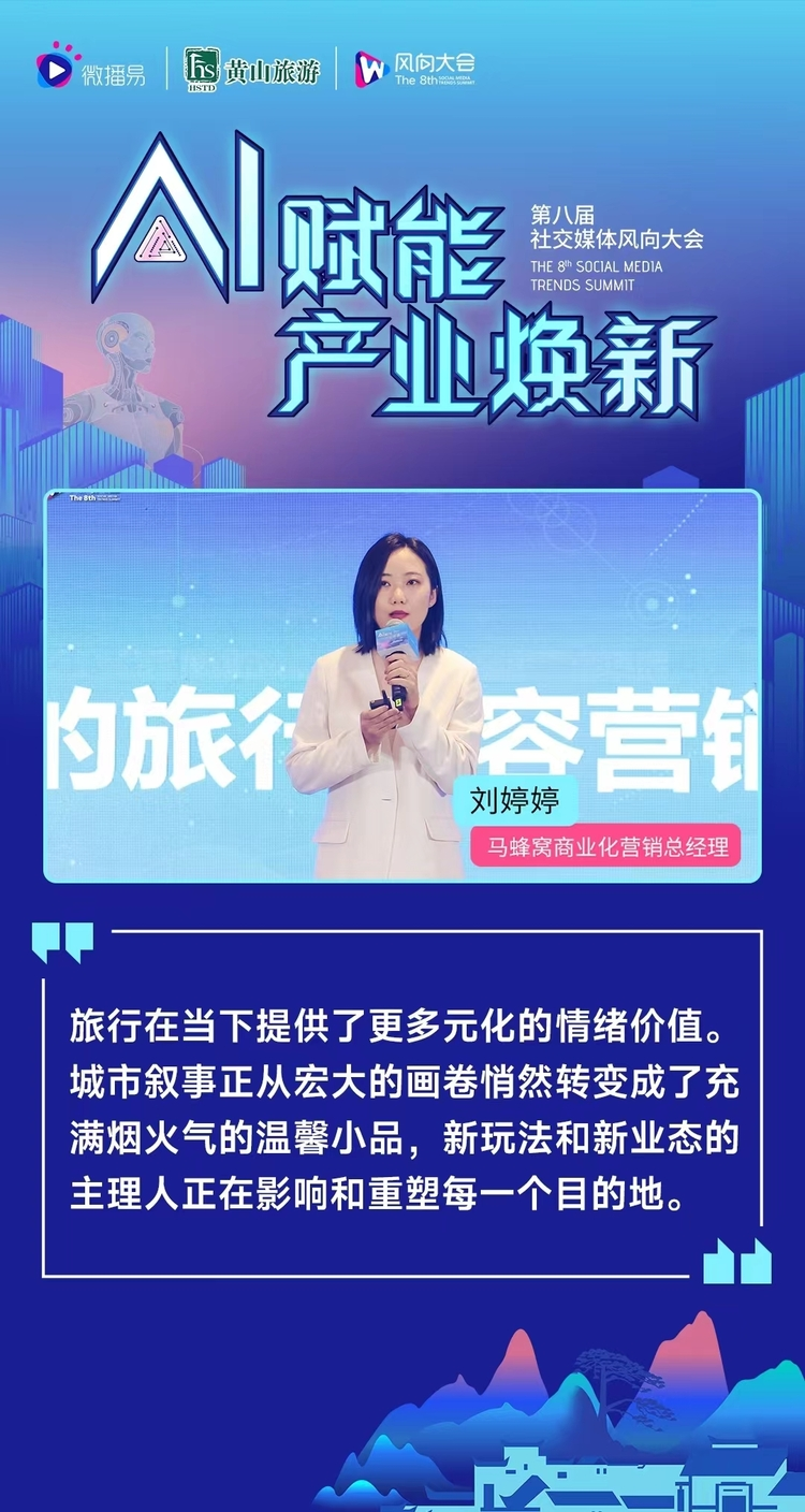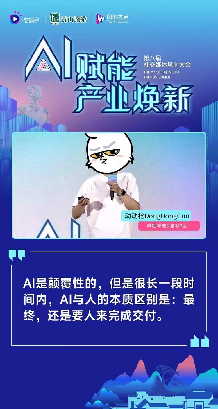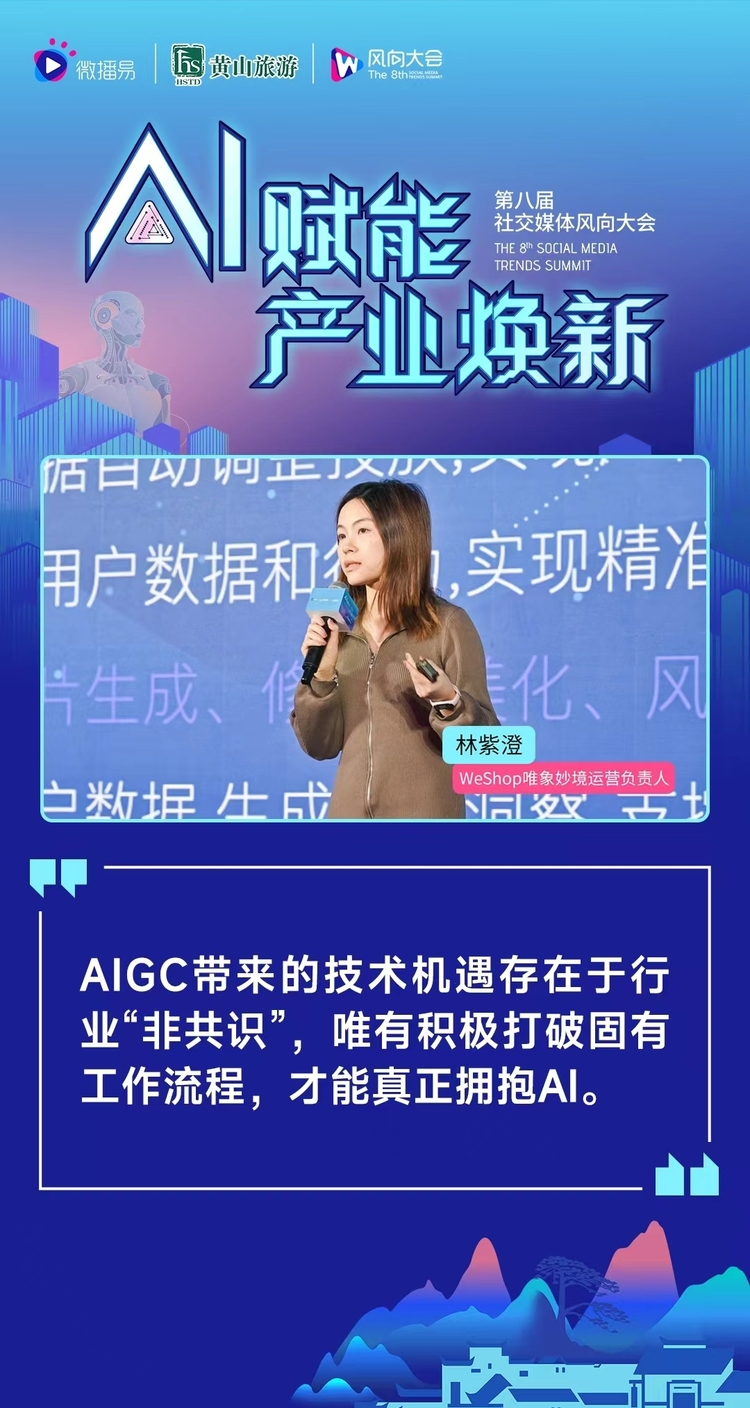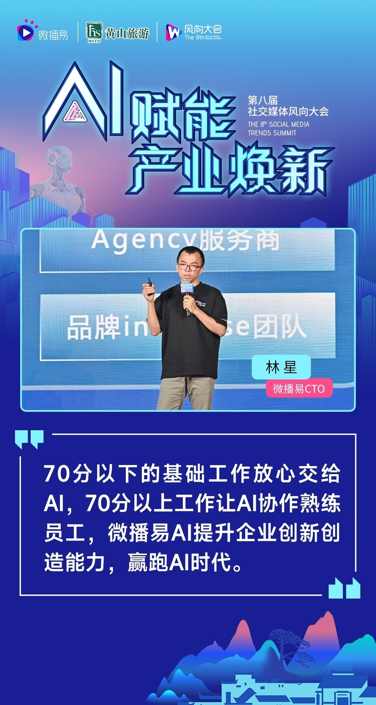 4月15日,由黄山市人民政府指导,微播易、黄山旅游主办,第八届社交媒体风向大会“AI赋能•产业焕新”峰会在黄山举行。本次大会邀请AI领域应用专家、平台方、技术方、品牌方、内容创作者代表,就产业创新、营销创新、文旅创新进行了一天的脑暴探讨,聚焦应用场景、着重实践落地、期望能通过“AI+”创新,“+AI”提效,推动AI新质生产力在产业中落地应用。