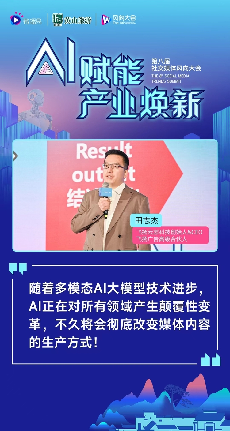 从PGC到UGC,再到AIGC,当内容生产“拥抱”新质生产力,一个互联网营销的新时代也随之到来。飞扬云志科技创始人&CEO 飞扬广告高级合伙人 田志杰指出:“随着多模态AI大模型技术进步AI正在对所有领域产生颠覆性变革,不久将会彻底改变媒体内容的生产方式!”