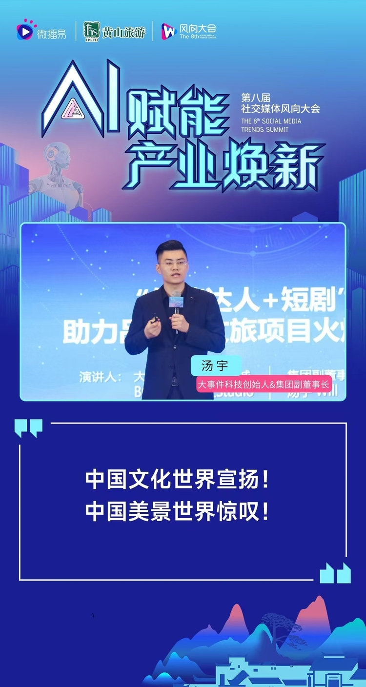 为什么AI能在文旅营销板块绽放出花?从破层出圈的《逃出大英博物馆》到口碑爆棚的《我在八零年代当后妈》,微短剧在过去一年迎来了爆发,频频占据话题热搜榜。“微短剧+文旅”是“影视综+文旅”的轻量版,也是“短视频+文旅”的加量版,大事件科技创始人&集团副董事长汤宇说道:”中国文化时间宣扬!中国美景世界惊叹!”如何让内容更有张力、产能高速释放,也许是下半程的答案。
