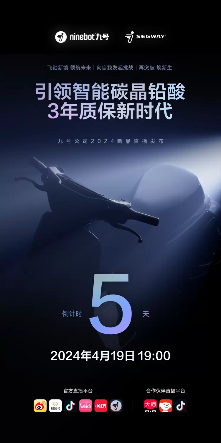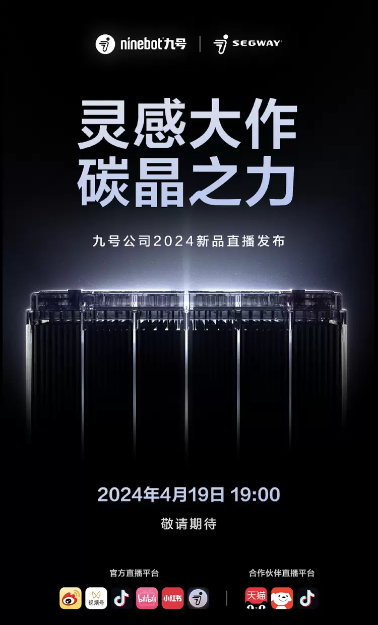 九号公司正式官宣:2024新品直播发布会即将于4月19日 19:00举行,并同步多个社交平台、电商平台线上直播。届时,将会有年度重磅级新品震撼亮相。包括九号智能电动两轮车、九号电动滑板车在内的多个产品线均将获得更新。从提前曝光的预热物料中可以看出,大概率还会有一款“具备变革和颠覆性”的和电池能源相关的产品或技术的推出。
