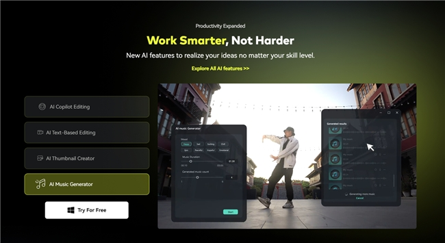 Wondershare Filmora 13则集成上线AI音乐生成器/AI文本成片等AI生成功能,以及AI文字快剪/智能人声分离/AI智能遮罩等AI智能编辑功能,从内容生成、音视频剪辑到交互方式多元AI化赋能全球创作者。