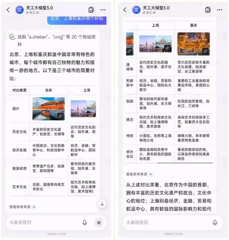 图表绘制:「天工3.0」全面提高了逻辑推理能力与用户自然语言Query的理解能力,使其能够更精准地判断用户需求,独立生成并调用代码,结合文本需求实时进行内容分析及图表构建,为用户带来更直观、高效的对比结果。