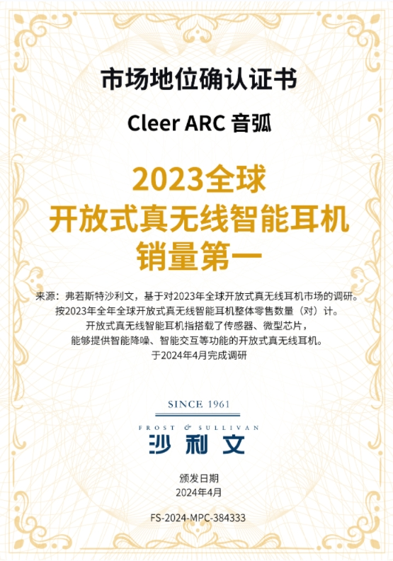 近年来,随着通信、物联网及智能硬件相关技术的不断发展,无线耳机产品的市场规模迅速增长,各大厂商纷纷入行耳机赛道。作为开放式耳机赛道的领跑者,Cleer凭借在耳机行业十余年的不断深耕,旗下的ARC 音弧系列耳机,近日荣获全球知名咨询公司弗若斯特沙利文(Frost & Sullivan)颁发的“2023年全球开放式真无线智能耳机销量第一”的认证。