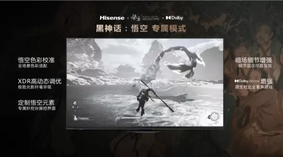 音质方面,海信视像联合杜比,进行杜比全景声游戏声效校准,实现全程无损的原生杜比品质。“海信电视ULED X系列新品将全线配备‘黑神话:悟空专属模式’,全球20余个国家和地区的消费者还可在海信电视卖场体验游戏的精彩片段。”王烨东表示。