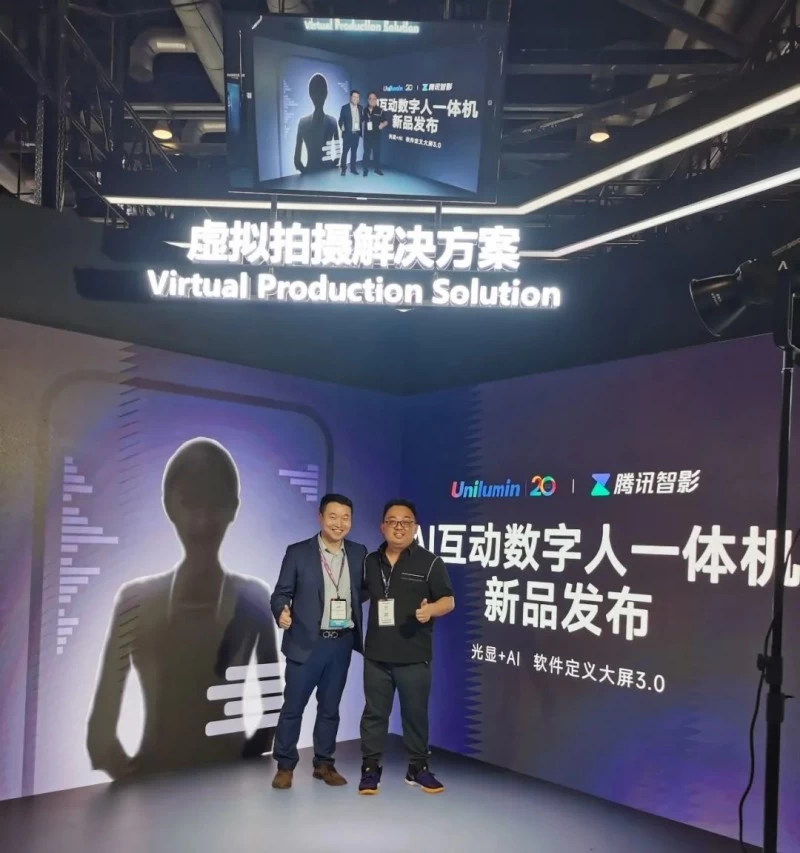 洲明集团副总裁梅志敏(左)与腾讯智影商业化总经理陈淮(右)现场合影