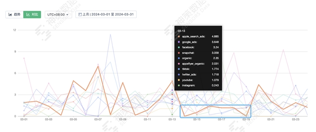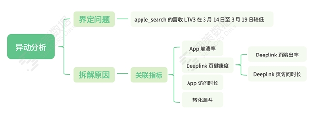 该海外电商平台在 3 月 14 日 ~ 3 月 19 日的 apple_search 的营收 LTV3 表现趋势异常,迫切需要诊断和解决营收下降的问题。