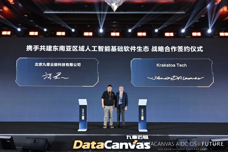 九章云极DataCanvas公司与国际领先的新加坡科技企业KrakatoaTech公司签署《携手共建东南亚区域人工智能基础软件生态》战略合作协议。根据协议,双方将合作推动打造技术领先的、自主可控的创新型智算中心软件操作系统和人工智能平台,进一步促进东南亚区域的通用大模型、垂直业务大模型及小模型等人工智能技术创新应用及产业智能化转型,联合印尼电信Telkomsel共同打造具有东南亚区域影响力的人工智能基础软件创新示范区。