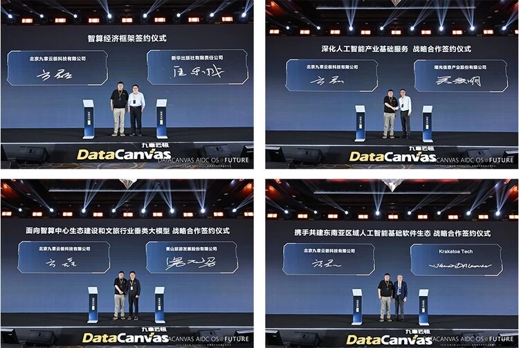 九章云极DataCanvas公司与新华出版社、曙光信息产业股份有限公司、黄山旅游发展股份有限公司以及Krakatoa Tech等海内外核心生态伙伴,正式签署四项战略合作协议