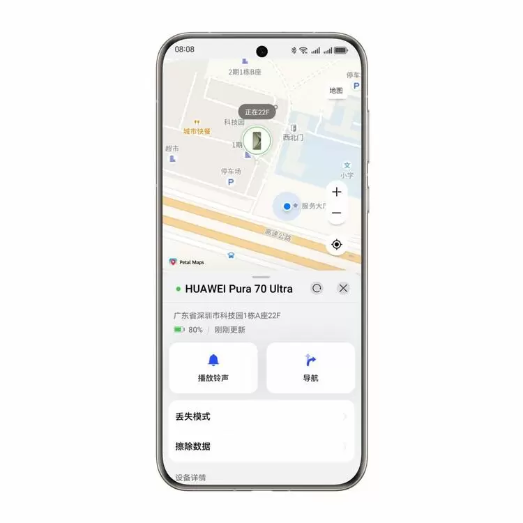 华为 Pura70 系列手机,也为设备本身增加了更多安全保障,华为云空间的 " 查找设备 " 功能在华为 Pura70 系列上首次搭载了楼层定位,为用户提供了更加精准的定位服务。无论是商场、写字楼还是其他复杂环境,在人流量密集、信号干扰非常多的情况下,华为 Pura70 系列依然能精准定位手机位置,帮助用户快速寻找手机。目前,楼层定位功能已经支持全国 1 万 + 个城市主流商圈、机场、车站等超流量密集区域。