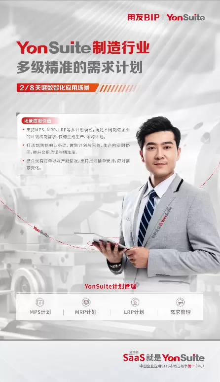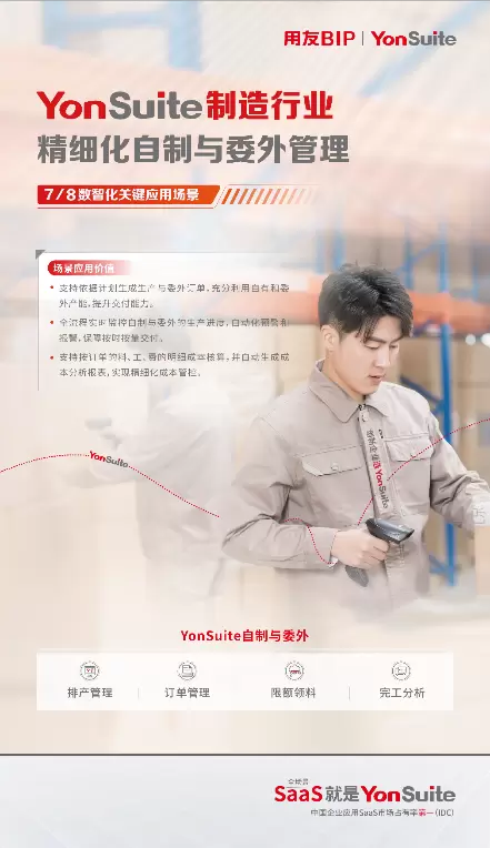 用友YonSuite通过提供全场景、一体化的服务,为制造企业的生产工厂数智化运营提供强大支持,包括产品个性化随需选配、多级精准的需求计划、优化的替代料管理、支持多种生产组织模式、支持物料齐套分析及精准备料、车间作业精细化管理、精细化自制与委外管理、以及全链路质量管控,从而推动制造企业智能化制造升级与精细化工厂运营管理,为制造行业企业塑造全新的竞争优势。