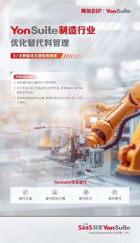 替代料管理是制造企业在应对物料短缺、降低成本、提高生产效率等方面的重要策略。YonSuite通过其强大的功能,为制造企业提供了全面而灵活的优化替代料管理方案。YonSuite可以让企业针对不同订单快速定义替代方案,并支持基于替代料制定生产任务。系统还能智能优化替代方案,使物料得到充分利用,减少积压与浪费,降低生产成本。
