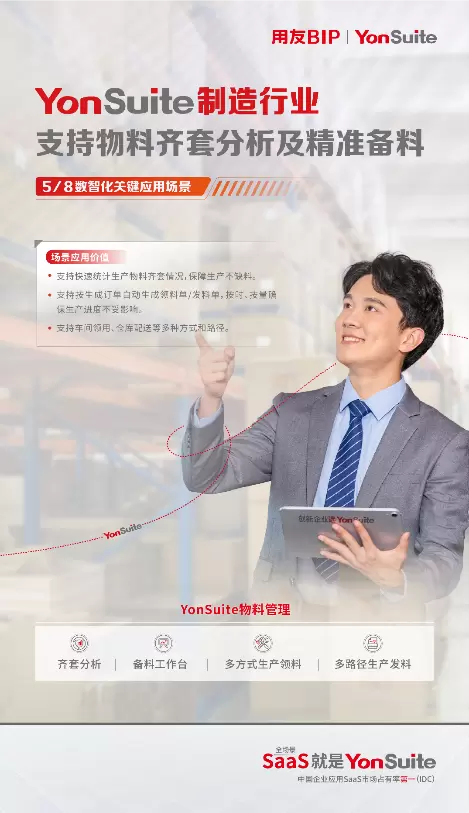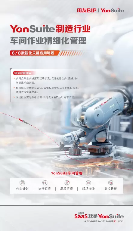 YonSuite制造行业生产工厂的八大关键应用场景,为企业提供了全方位的生产智造升级与工厂精细运营管理,强化了生产工厂计划管理、任务管理及车间作业管理,不仅实现了基于物流管理降本增效,更为企业未来的竞争力提升和商业价值创造奠定了坚实基础。展望未来,YonSuite将继续发挥其优势,助力制造企业打造新质生产力!