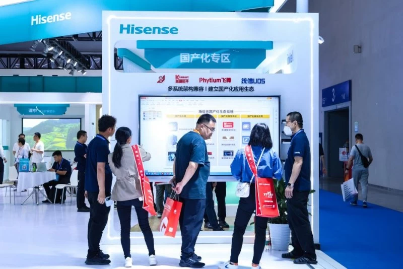 值得一提的是,海信还在现场打造国产化展区,引来诸多围观。此前,教育部联合中央网信办等六部门推动数据中心、信息系统和办公终端国产化,增强数据保障能力。基于此,海信全新打造了纯国产化平台一体机,该产品基于自研芯片,并与统信、麒麟等主流操作系统实现深度兼容,确保了全链路国产化与多系统之间的无缝衔接。整机采用国产化物料,并融入了海信自研的高性能芯片,从而大幅提升了系统的自主可控性与安全性。
