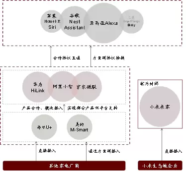 目前包括苹果HomeKit、谷歌Nest、三星Smart Things、亚马逊等平台在国外市场圈地正酣,国内华为、阿里、京东的智能家居平台纷纷通过与家电厂商的合作,扩大自己的平台覆盖范围,而小米则较为封闭,着力塑造自己的生态圈。整体而言,目前各个平台仍然相对较为独立,消费者在购买智能家居产品时面临“站队”抉择,不利于行业的普及发展。