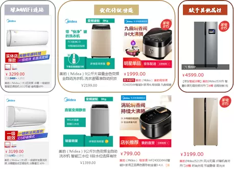 产品端的智能化,增加了产品附加值,让传统家电厂商享受到更高的溢价。1)初步的智能化是给产品附加Wi-Fi,例如美的目前京东在售的空调,从1999元到5699元的大部分机型都具备此“WiFi智控”功能。2)第二种智能化是对家电的功能做了更细致更贴心的优化。例如含有智能芯片的波轮洗衣机价格也比普通波轮洗衣机高了57%;可以识别米种、智能选择加热曲线的美的IH全智能电饭煲价格则是普通IH电饭煲的2.5倍。3)更高级的智能化,是赋予了产品在其传统功能之外的属性,例如人工智能、语音交互、影音娱乐。京东和美的联合打造的智能冰箱,价格比普通多门冰箱高出44%。