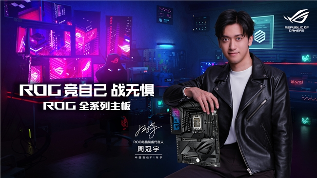 2024年2月27日,ROG官宣首位中国F1车手周冠宇成为新一任ROG电脑装备代言人。2006年,ROG横空出世,随后ROG玩家国度首款主板Crosshair诞生。秉承“不断超越”的品牌精神,ROG推出了一系列令人惊叹的主板产品,不断创造出为玩家量身打造的设计和功能。ROG主板已整装待命,和周冠宇一起无惧向前,超越自我,突破极限!