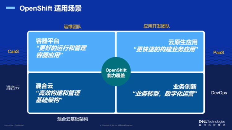 其次,具备无缝集成和自动化以及统一管理能力,通过双方的深度集成,戴尔ACP for OpenShift实现了对OpenShift平台统一软硬件管理,能够消除跨架构复杂性,自动化部署、升级及维护,好处在于能够更好地消除虚拟化层,降低购置和运营成本;同时通过软件驱动的自动化方式,也为云原生工作负载带来类似云的敏捷性和效率。