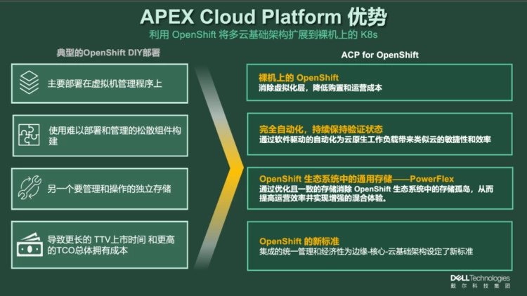 但也要看到,虽然OpenShift提供了很多的便利性,不过企业在部署和管理容器化应用的过程中仍然面临挑战,从采购硬件,到配置软件环境再到维护运营,往往需要投入大量的资源。在此背景下,戴尔科技与红帽公司深入合作,推出了Dell APEX Cloud Platform for Red Hat OpenShift(以下简称戴尔ACP for OpenShift),就为企业轻松实现容器化部署和管理提供了全新的解决方案。