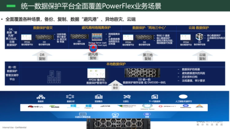 第四,安全方面,PowerFlex不仅通过集成F5实现业务级的“双活”,同时也提供了“三位一体”的数据保护方案,即全部数据,可通过备份方式完成保护;重要数据,则可以通过灾难恢复(DR)实现保护;对于最为核心的数据,仅有备份和容灾仍然是不够的,这就需要通过弹性网络恢复(CR)实现全面的保护。目前,戴尔科技的统一数据保护平台已全面覆盖PowerFlex业务场景,包括备份、复制、数据“避风港”、异地容灾、云端等等。
