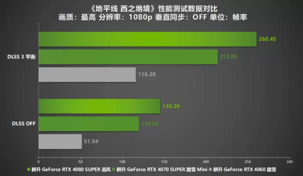 在1080P分辨率下的测试中,《地平线 西之绝境》展现出了良好的优化效果。不使用DLSS技术时,除了耕升 GeForce RTX 4060 踏雪显卡外,其他两款显卡的平均帧数都轻松超过了100帧,保证了流畅的游戏体验。耕升 GeForce RTX 4060 踏雪显卡的平均帧数虽然没有达到60帧,但也非常接近。而开启DLSS 3技术的平衡模式后,游戏的帧率更有显著的提升,即使在最高画质下,游戏画面也变得流畅稳定。在这种模式下,耕升 GeForce RTX 4060 踏雪的平均帧数提升到了116.28帧,而另外两款显卡的平均帧数更是轻松超过了200帧。