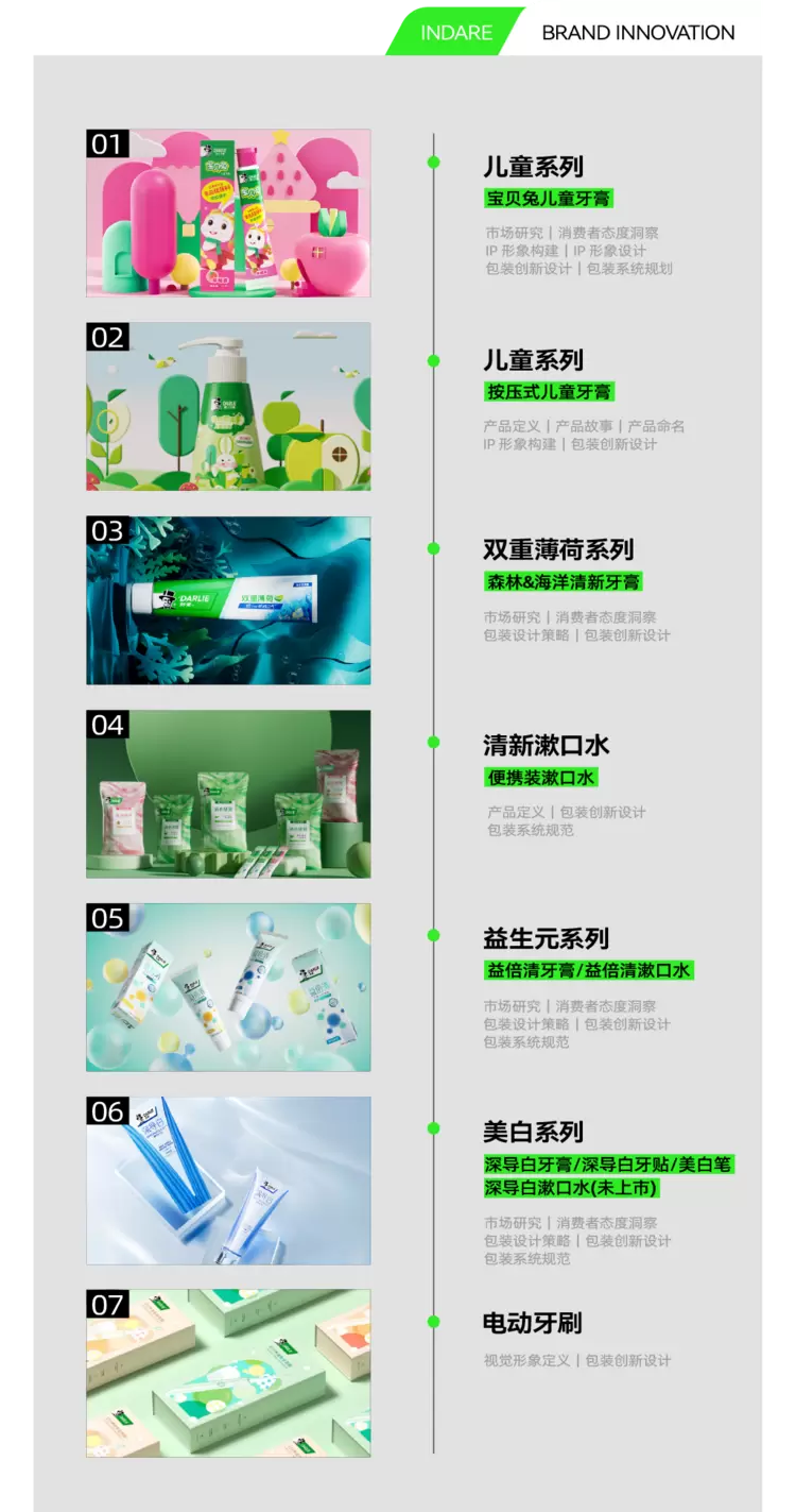 inDare 与「好来」的合作之旅长达三年多,「黑人牙膏」蜕变为「好来」后,为配合品牌的全新形象,inDare 基于品牌创新的专业维度,助力规范品牌色彩、统一品牌符号、品名标识和元素风格、突出功效性品名的信息层级等,从基础线、中端线到高端线,涵盖儿童牙膏、成人牙膏、电动牙刷、漱口水等品类,针对细分领域的产品包装线进行策略与设计的全方位升级,从而带来焕然一新的品牌包装形象。