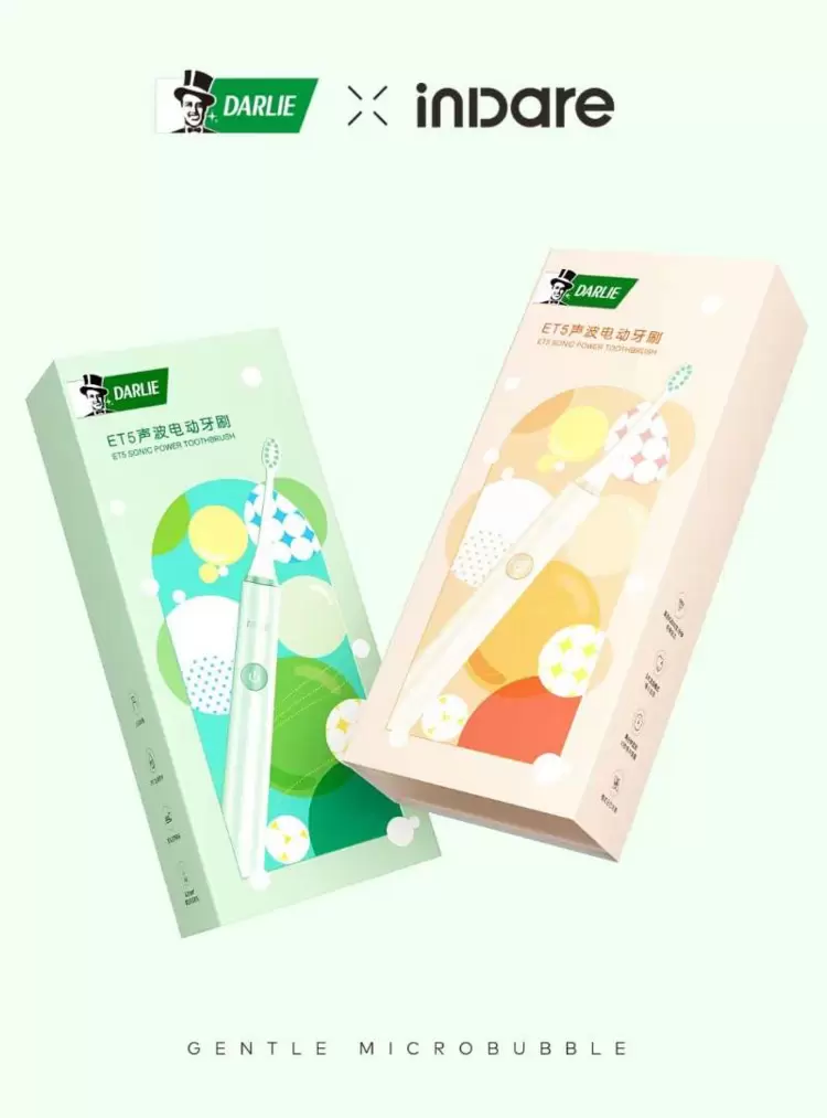 在对以 90 后新女性为目标受众的「好来」ET5 密泡声波牙刷的设计上,我们整体延续了品牌“专业清新”的视觉风格,同时结合新女性的审美倾向与对自在舒适和全面健康的关注,提出“自然元气 自在健康”的设计概念,并提炼出 “泡泡”元素作为包装视觉的核心。