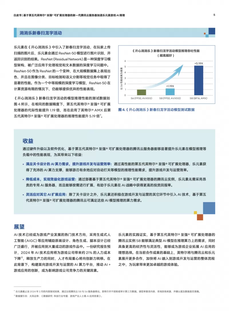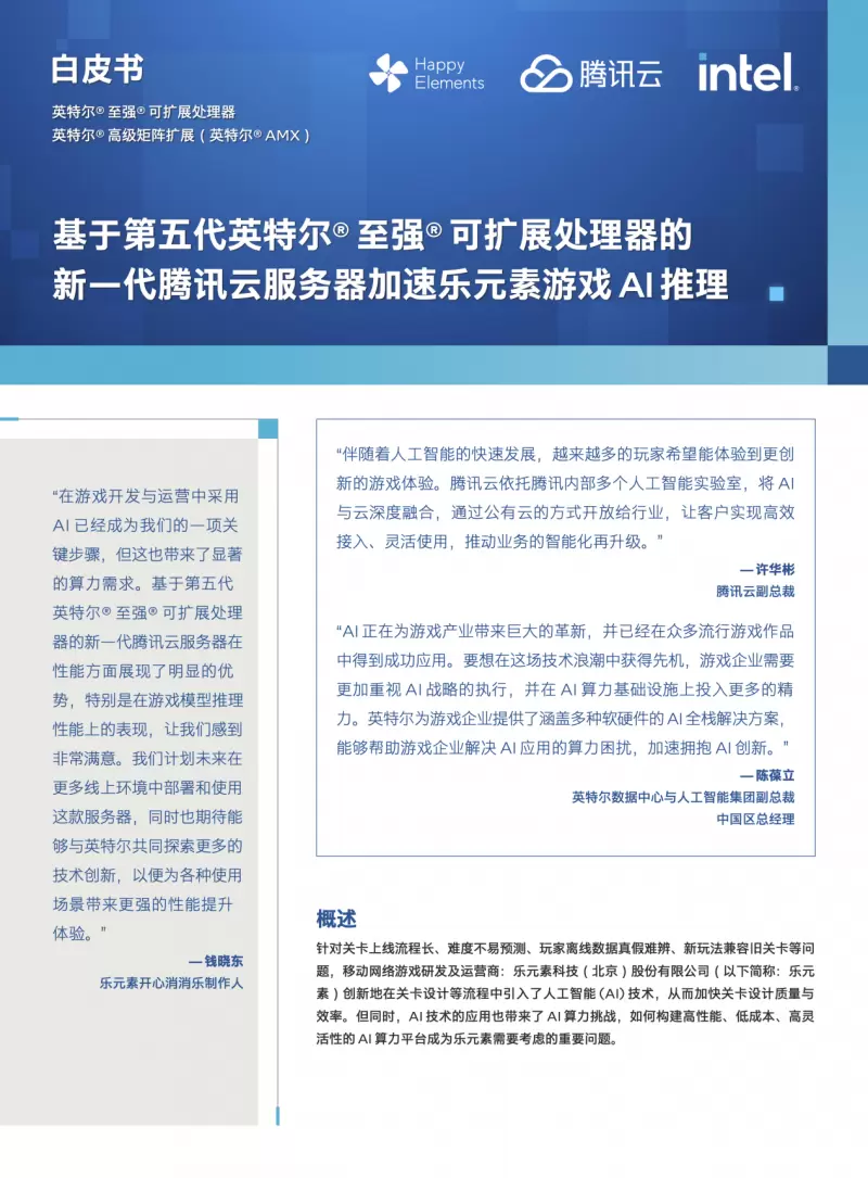 探索科技前沿,重塑游戏未来——这是一份集智慧与技术于一体的白皮书,由《开心消消乐》、英特尔和腾讯云携手呈现。通过第五代英特尔®至强®可扩展处理器以及腾讯云服务器的深度融合,我们得以见证AI推理在游戏体验改变中的重要角色。这份白皮书将为你展示科技与游戏的紧密结合,无论你身处哪个行业,都将从中得到深刻的启发。一起探索科技的边界,感受AI在游戏中的变革力量!