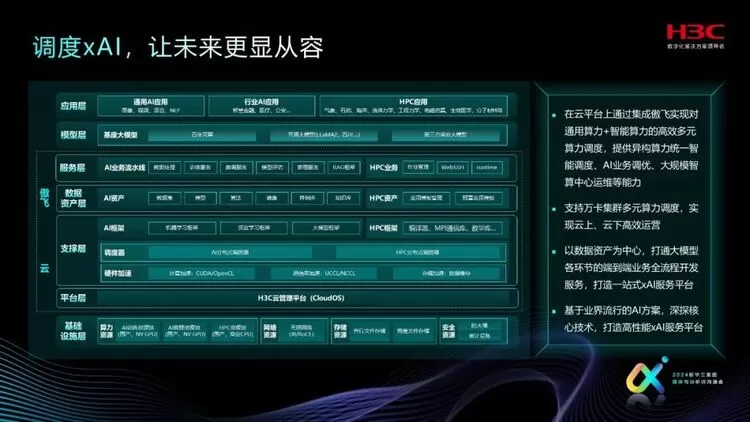 傲飞算力平台是新华三推出的智能调度和业务开发平台。傲飞平台支持万卡集群的通用算力、智能算力统一调度,可将底层算力资源和上层AI及科学计算业务串联起来,构建通用性和统一性。