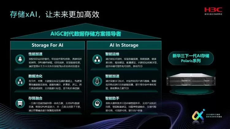 在存储领域,新华三推出的下一代AI存储——Polaris系列则将Storage For AI和AI In Storage两大思路融合为一。