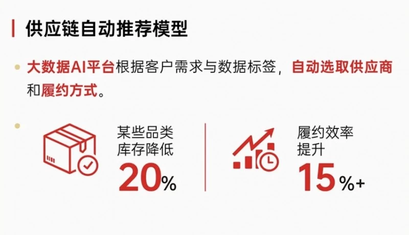 基于人工智能技术的供应链自动推荐模型、商品标准库模型、齐心数字人、AIGC等技术研发与应用为齐心集团业务发展提质增效,为其提供了未来的业务增长潜力。其中,齐心集团供应链自动推荐模型的应用,实现部分品类库存降低20%,履约效率提升15%+。该模型通过大数据AI平台根据客户需求与数据标签,自动选取供应商和履约方式,为客户实现降本增效,促进供应链上下游高效协同发展。