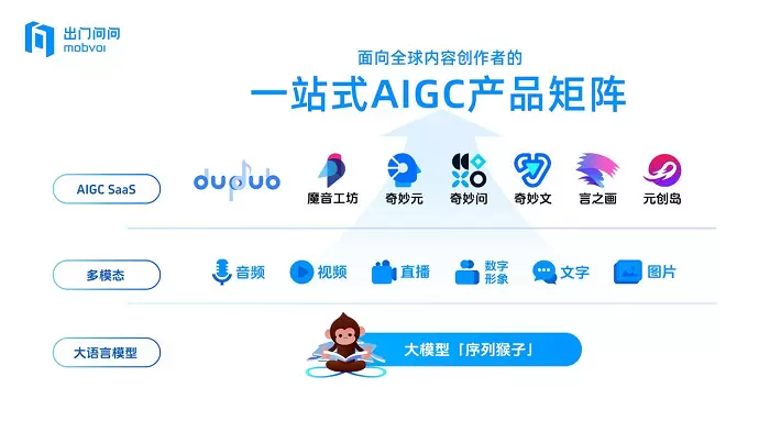 2020年,出门问问推出能够理解并生成文本的大模型UCLAI,并发布生成式AI在中国的首个商业应用——AI配音平台「魔音工坊」。2023年,出门问问推出升级版通用大模型「序列猴子」,以及一站式数字人制作平台「奇妙元」、企业AI交互式数字员工生成平台「奇妙问」以及「魔音工坊」海外版「DupDub」等AIGC解决方案。