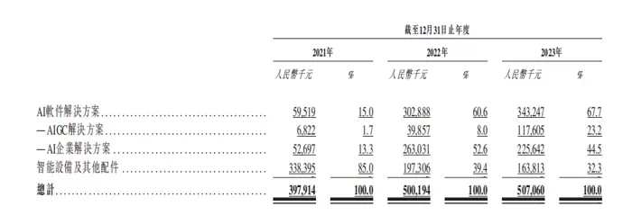招股书显示,2021-2023年,出门问问的收入分别是3.97亿元、5.02亿元和5.07亿元,其中来自AI软件的收入从2021年的0.60亿元增长到2023年的3.43亿元,年复合增长率为140%,AIGC解决方案在2021-2023年的收入分别为682.2万元、3985.7万元和1.18亿元,复合年增长率超300%。