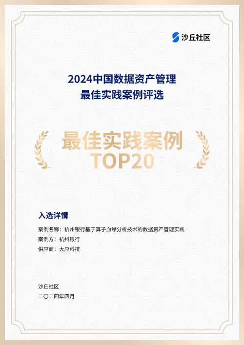 近日,数字化领域权威研究机构沙丘社区重磅发布「2024 中国数据资产管理最佳实践案例」Top20 榜单,凭借在数据管理领域的技术优势及领先的落地实践经验,Aloudata BIG 主动元数据平台携手杭州银行打造的《基于算子血缘分析技术的数据资产管理实践》荣登榜单。