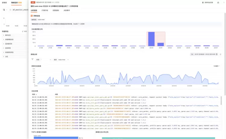 在“日志智能检测”功能中,观测云运用智能检测算法,监控工作空间内采集器产生的日志数据。智能识别日志数量的突增 / 突降、错误日志的突增的异常数据,及时发现不符合预期的异常状态,及时提醒团队关注业务是否有异常表现。