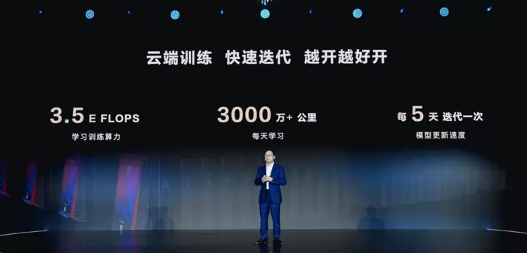 依托华为云强大的底座能力,实现能力的快速迭代。算力方面达到 3.5E FLOPS,训练数据量已达日行3000万公里,半年实现3倍增长,模型每5天迭代一次。