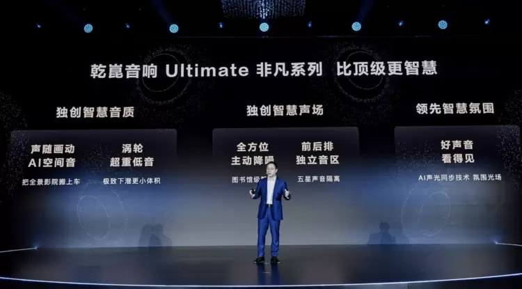 全新的乾崑音响,开创智慧音响新赛道。本次发布最豪华的非凡系列,带来更震撼智慧音质,首创声随画动技术,采用AI声画解析技术和AI空间音技术,能自根据画面在舱内重混出3D声音,实现身临其境的视听感受。新升级的智慧声场体验,实现前后排座位独立音区,前排K歌,后排观影互不干扰。
