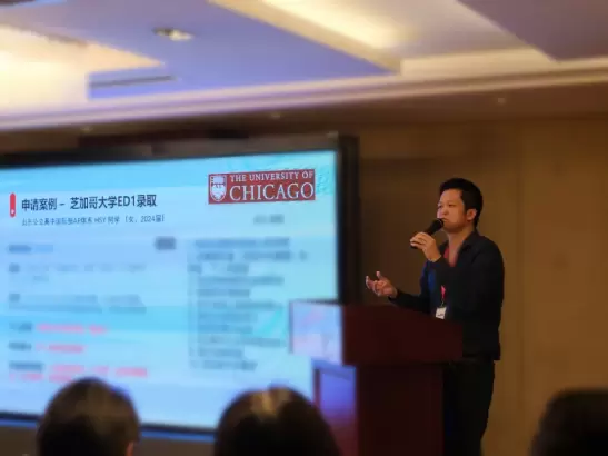 乐鉴辅导的学生不仅限于北上广超一线城市,更是触达了珠海、乌鲁木齐、济南、青岛、南京、宁波等地学生,以及美国、加拿大、墨西哥、瑞士、英国、南非等地的中国或华裔学生。讲座不知不觉已经过去一个小时,Jim老师再次走到台前,开始为大家分享济南某校同班同学同时录取芝加哥大学的案例。