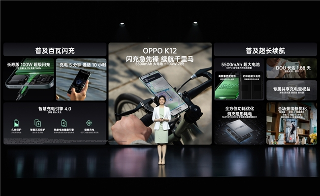 2014 年,OPPO发布了第一代VOOC闪充手机,此后10年OPPO不断引领手机快充技术的发展,主导制定移动终端融合快充方案国际标准,在全球手机行业中OPPO快充相关专利授权维持量稳居第一,让全球3亿人享受OPPO闪充带来的便利。随着时代的发展,充电快的同时,更长的续航也已成为用户日益增长的强烈需求,因此,OPPO不仅仅要做闪充的开创者,更要做闪充+长续航的普及者。OPPO K12很好的解决了中端机用户快充与续航无法兼顾的用电体验痛点,普及百瓦闪充+超长续航,让更多人真正同时享受更快充电和更长续航的旗舰级体验。