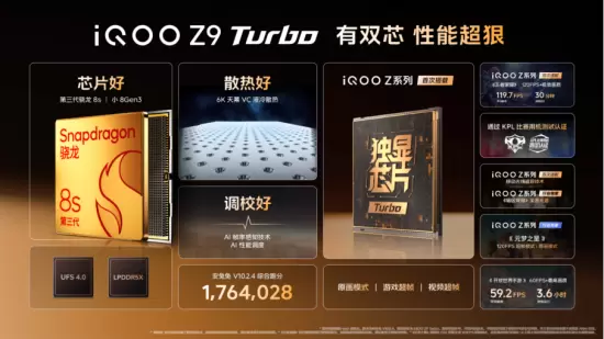 作为全新一代中端旗舰,iQOOZ9Turbo所搭载的第三代骁龙8s采用了与第三代骁龙8旗舰平台相同的CPU架构,通过iQOO与高通开展的为期289天联合调校,带来顶级性能和更优功耗。首次搭载的独显芯片Turbo,进一步提升高帧游戏体验,强化iQOOZ9Turbo在游戏及其他各项性能上的表现。