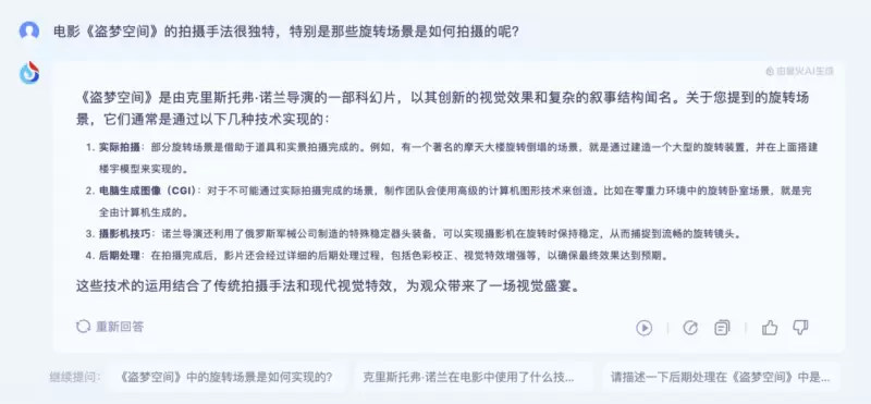展会现场,讯飞星火APP以其丰富的跨领域知识和出色的语言理解能力吸引了大批观众下载体验。简单来说,讯飞星火大模型就像一个超级智能的大脑,可以理解和回答你的任何问题,帮你完成任务。现场观众对一些影视拍摄技巧和幕后故事感兴趣,主动体验提问:“电影《盗梦空间》的拍摄手法很独特,特别是那些旋转场景是如何拍摄的呢?”讯飞星火迅速给出了答案。