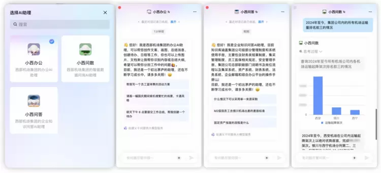 西部机场集团此次上线的“小西办公”、“小西问答”及“小西问数”,将率先应用于行政办公、知识问答、智能问数等办公及业务场景。其中,“小西办公”能够提供文案创作、润色续写、AI画图、脑图绘制、文档摘要、创建日程等功能,让办公协同更高效;“小西问数”能够基于企业大数据进行智能运算,以聊天问答的方式按需生成数据报表、多维数据看板,提供个性化决策支持;“小西问答”则能够基于企业知识库,灵活运用自然语言处理技术,理解问题并快速提供专业解答,提升标准作业效能。