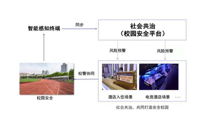 在校园安全管理上,形成校警联动、社会多方共同护校安园。基于目前校园安全管理现状,全民认证创新突破,以基于AI的数字身份认证与识别智能终端进行身份核验,实现学生、校内人员、外访客等身份的快速核验登记,严格把控校门;并与社会共治平台数据打通,凭借平台的预警模型和算力等能力,及时向基层派出所、学校、社区、街道等推送未成年人入住电竞酒店、异常时段校外游荡等风险预警信息,形成安全防范管理闭环。