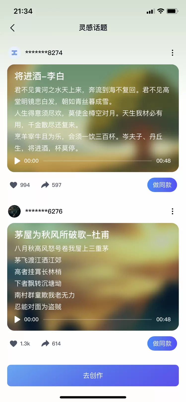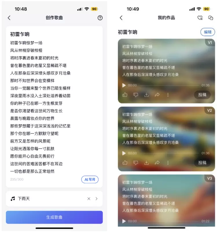 操作真的是极为简单,在天工APP的【音乐】板块,点击【开始写歌】,输入歌名,然后一顿傻瓜式的点击【AI写词】,选择一首喜欢的歌开始【生成歌曲】,就完成了上述歌曲创作。毫不夸张的说,有手就能创作。